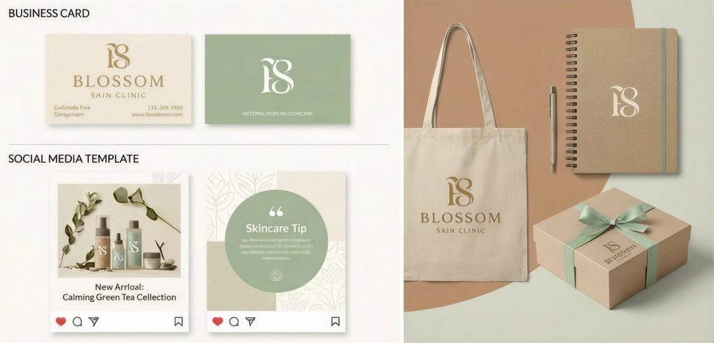品牌介紹:源自「肌膚如花般綻放」的核心精神,結合韓系美學的純淨、細膩與專業感。整體視覺以柔和低飽和色調為基礎,搭配簡約優雅的線條與比例,營造安心、放鬆且具高端質感的療癒空間。LOGO 以 B 與 S 字母融合,象徵專業技術與溫柔呵護的平衡,傳遞診所對肌膚狀態、個人化管理與長期美感養護的重視,讓每一次保養都成為肌膚自信綻放的開始。